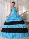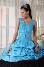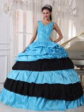 V Neckline Cheap Sky Blue Quinceanera Dress With Black