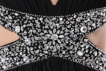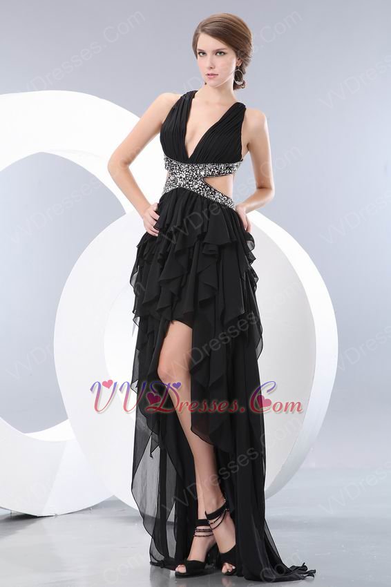Deep V-Neck Exposed High Low Skirt Black Chiffon Prom Party Dress