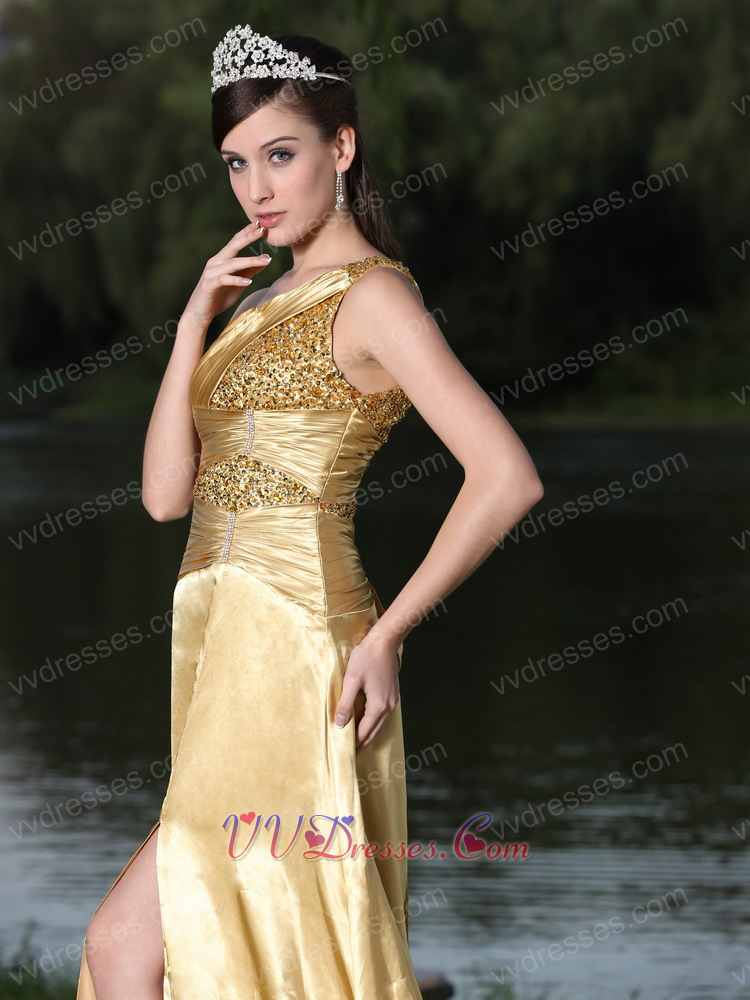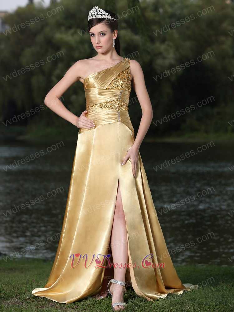 Amiable Gold One Shoulder Slit Design Prom Dress For Garden Party