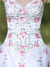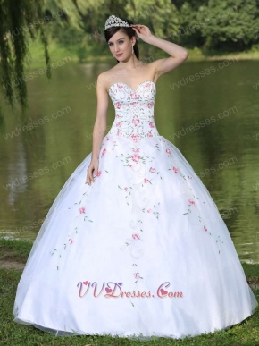 Embroidery Pink Floral Green Leaves Quinceanera White Dress Sixteen