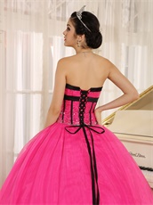 Pretty Puffy Floor Length Hot Pink Qunceanera Court Gown Black Details