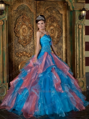 Orange Pink and Azure Contrast Cascade Skirt Quinceanera Dress