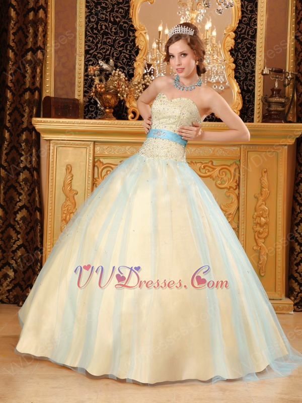 Yellow Quinceanera Girls Dress Covered With Blue Tulle