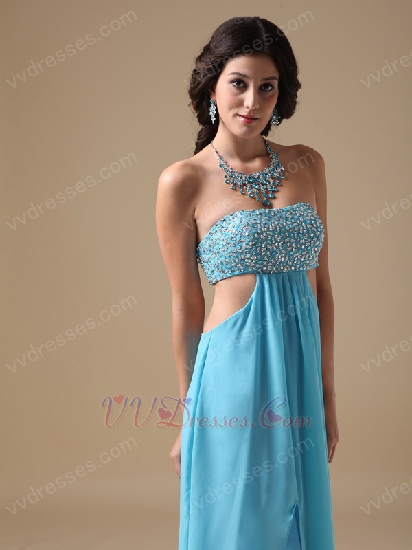 Beaded Exposed Aqua Chiffon Prom Dress With Show Leg Split