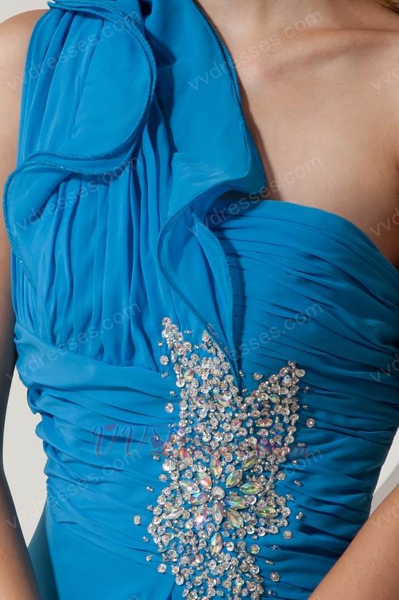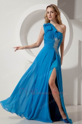 Unique One Shoulder Neck Blue Prom Dresses With A-line Split Skirt