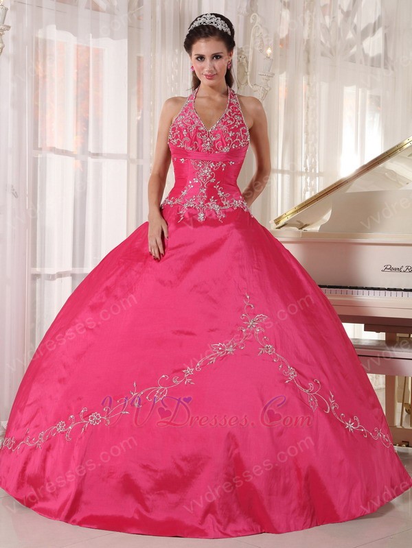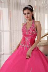 Deep Rose Pink Embroidery Halter Puffy Skirt Ball Dress