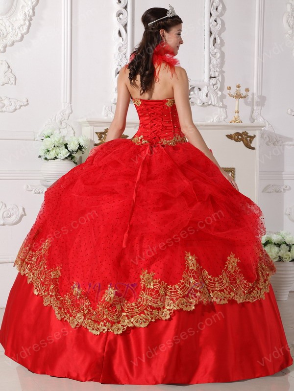 Halter Scarlet Red Quinceanera Dress With Golden Applique