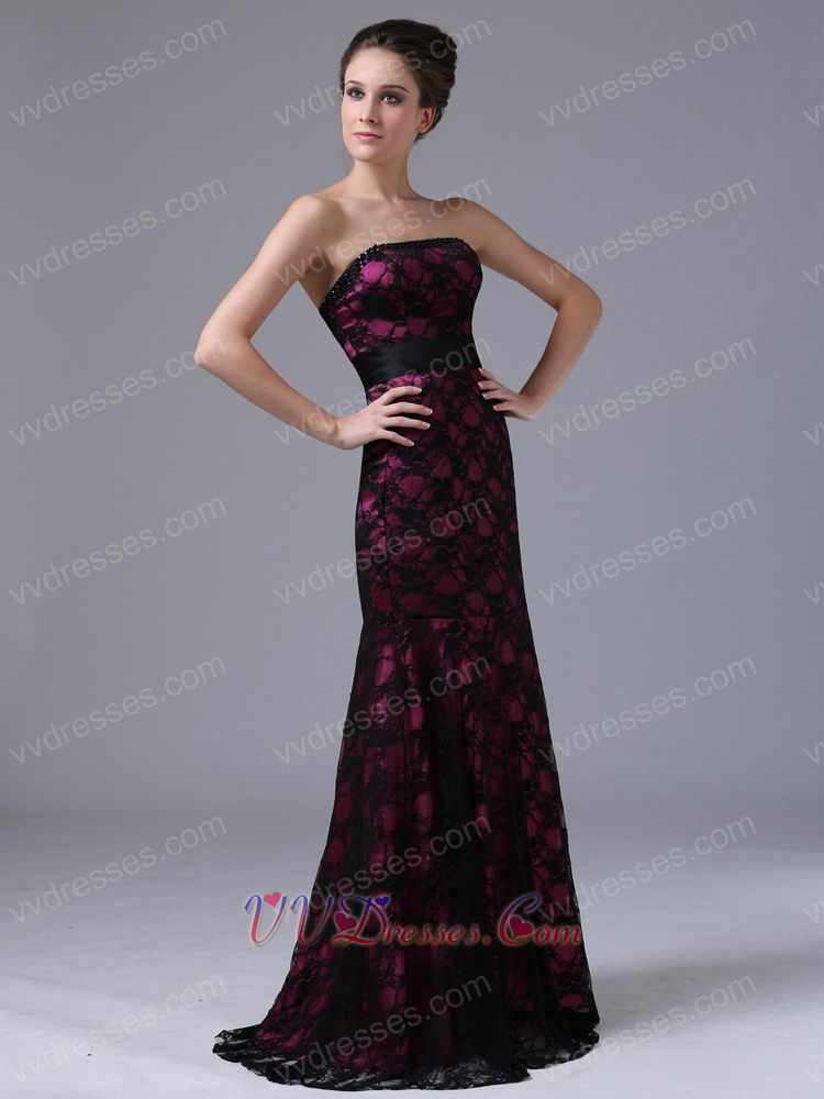 Strapless Black Flat Lace Mother Evening Dress Fuchsia Lining Inside