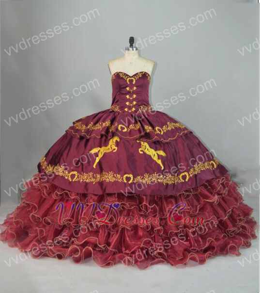 Western Sweet 16 Girl Burgundy Ball Gown Gold Horse Horseshoe Embroidery