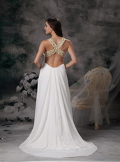 V-neck Cross Back White Chiffon Prom Dress With Golden Details Inexpensive