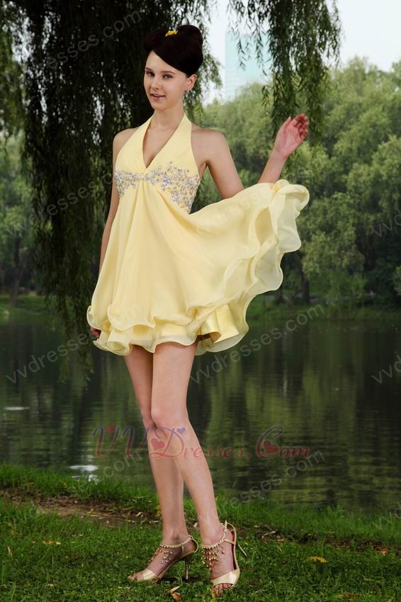 Sexy Halter Appliques Mini Length Yellow Short Prom Dress
