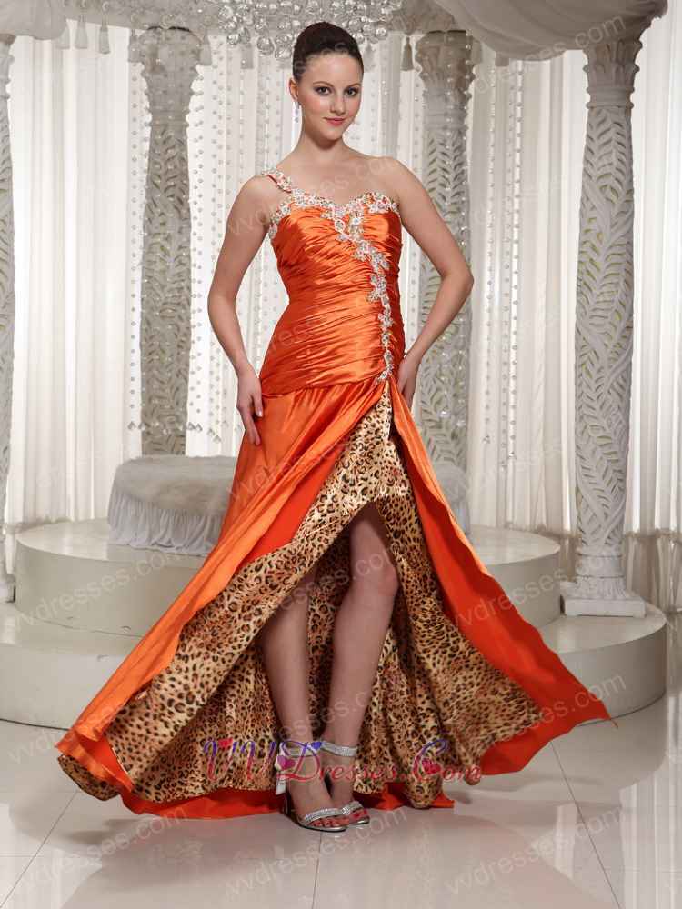 Ready To Wear High Slit Single Right Shoulder Orange Prom Dress Leopard Inside