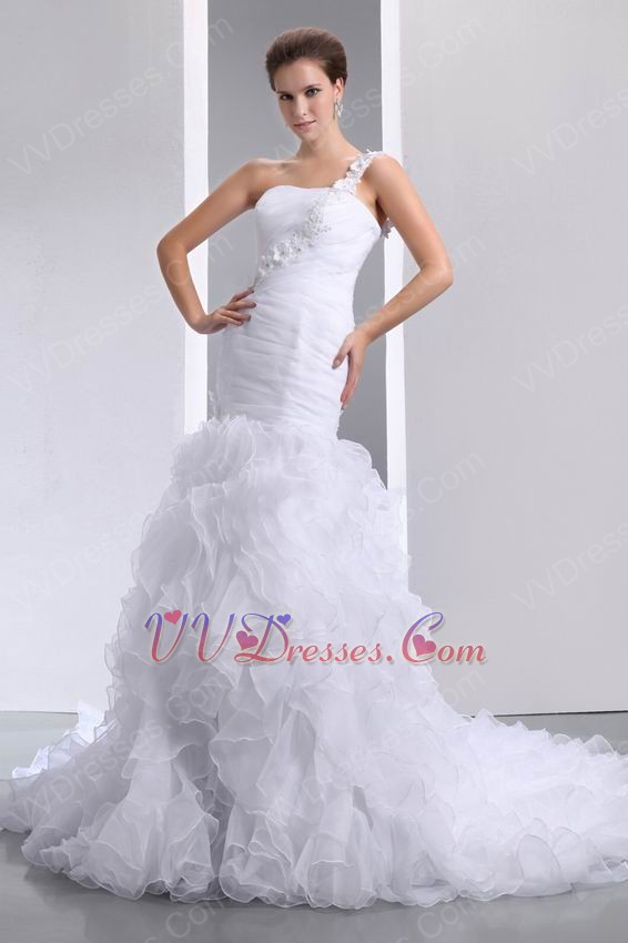 One Shoulder Flowers Straps Cascade Trumpet Wedding Dress White