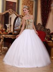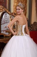 White Tulle Quinceanera Dress With Flaring Golden Sequin Bodice